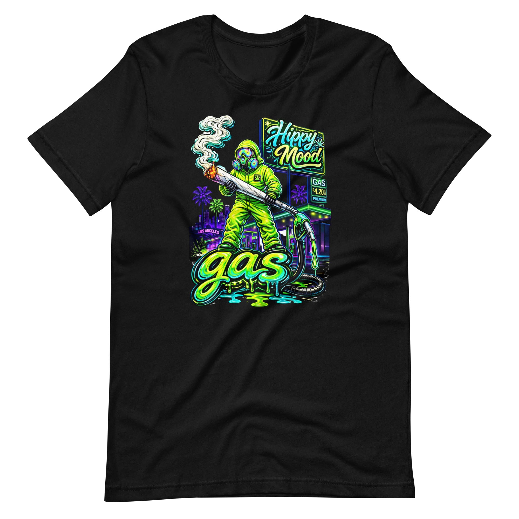 Turn up the vibe with the Premium Gas Drip Tee — a bold neon design inspired by West Coast nights and high-octane energy. Featuring a masked figure, oversized joint, and dripping “gas” graphics, this piece is built to stand out.